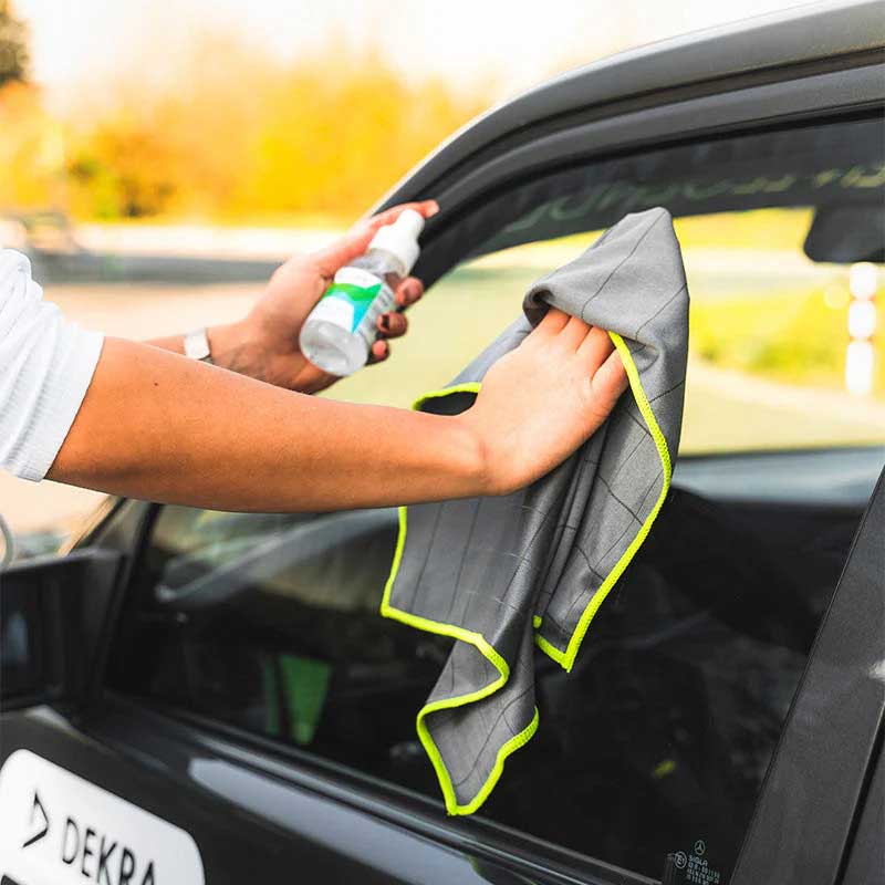 - Für besonders stark verschmutzte Scheiben sollte ein Glasreiniger mehrfach die Scheibe vollständig benetzen, sodass der Reiniger den Schmutz besser anlösen kann. Die nasse Oberfläche mit dem Green Scale abwischen.