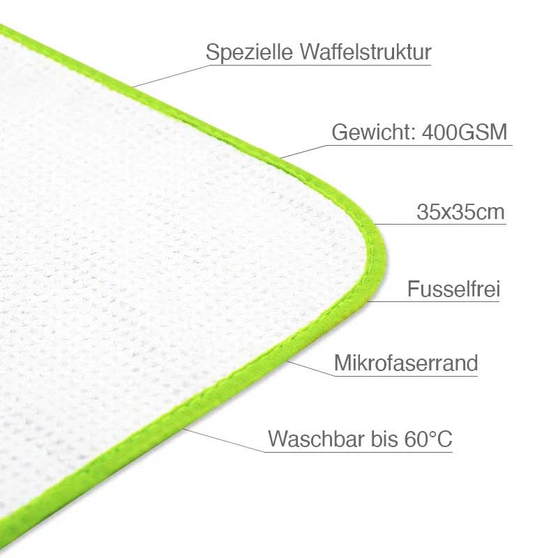 Die Spezielle Waffelstruktur ist für eine extrem schnelle Aufnahme aller Flüssigkeiten auf Oberflächen geeignet, ohne dabei Fasern und Fussel zu hinterlassen.